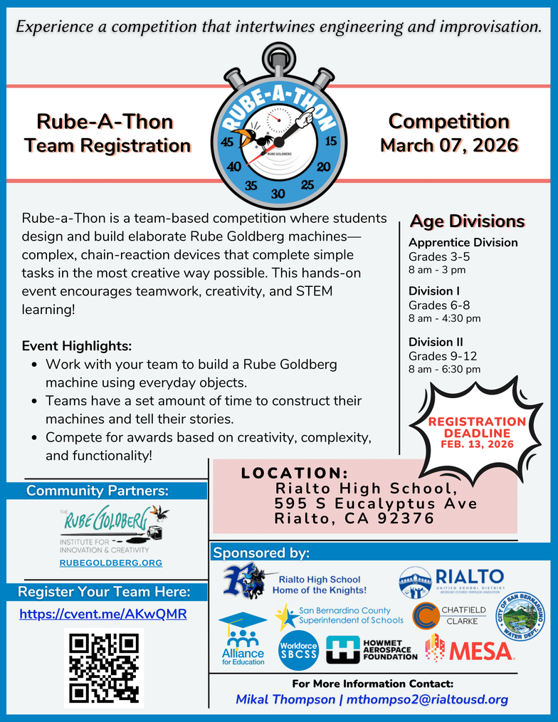 During this day-long event, the Rube-A-Thon will also have non-competitive activities for families and other spectators. This will include a maker space with different arts and crafts activities and mini-challenges.
